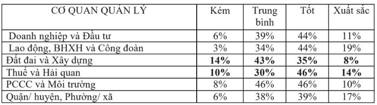 Nhìn chung, có 55-63% các lĩnh vực đều đạt loại tốt và xuất sắc; riêng cơ quan quản lý đất đai và xây dựng chỉ đạt tỷ lệ 43%. Cụ thể, lĩnh vực đất đai và Xây dựng bị 14% doanh nghiệp đánh giá kém, 43% doanh nghiệp đánh giá trung bình; lĩnh vực thuế và hải quan có 10% doanh nghiệp đánh giá mức độ kém, 30% đánh giá mức độ trung bình.