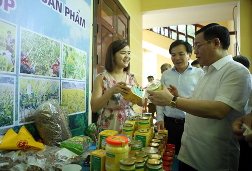 Phó Thủ tướng Vương Đình Huệ thăm quan gian hàng sản phẩm đặc sản của Tây Bắc. Ảnh: Báo Điện Biên. |
