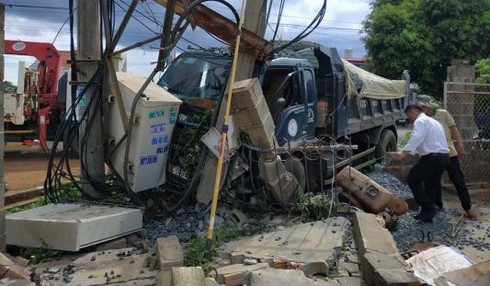Chiếc xe ben tông sập trạm biến áp khiến nhiều hộ dân mất điện |