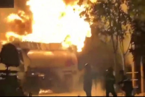 Lúc này, chiếc xe bồn chở hàng ngàn lít xăng dầu đang bơm xăng xuống hầm, bất ngờ phát hỏa rồi bùng cháy dữ dội, một số nhân viên hô hoán nhau dùng bình cứu hỏa mini dập lửa nhưng bất thành.