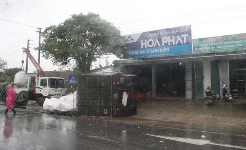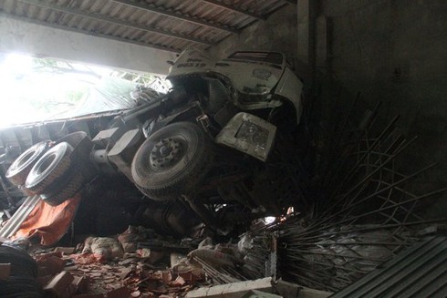 Theo ghi nhận tại hiện trường, chiếc xe tải đâm sập cửa cuốn của ki-ốt rồi lao vào bên trong, đè nát nhiều gạch, ngói, bao xi măng sau đó lật nghiêng.