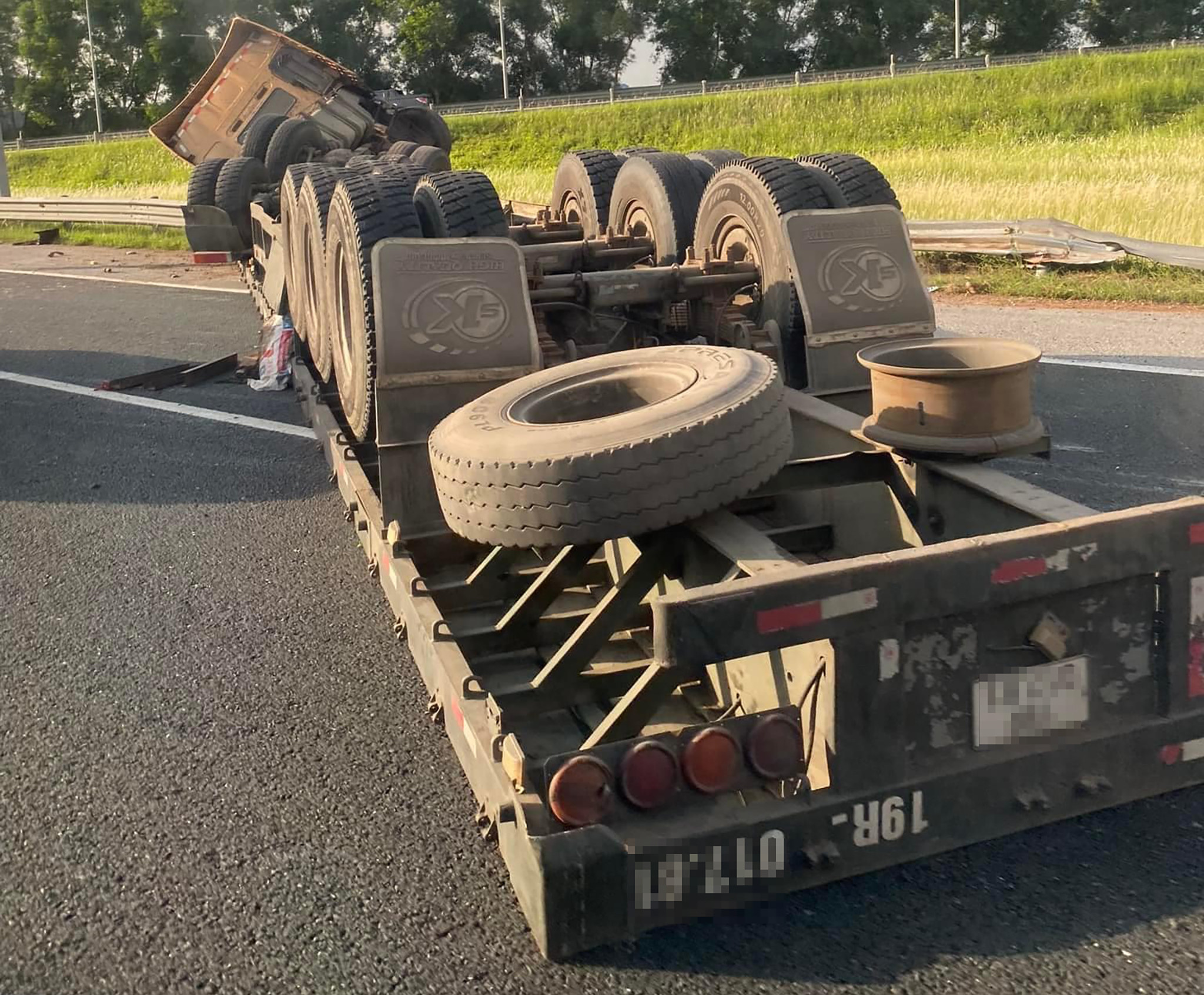 Cú va chạm mạnh đã khiến ô tô con bị biến dạng, xe đầu kéo bị lật úp, hai thùng container văng ra xa khoảng 50m nằm chắn ngang cao tốc. Đồng thời dải hộ lan bên phải đường cao tốc bị móp méo.