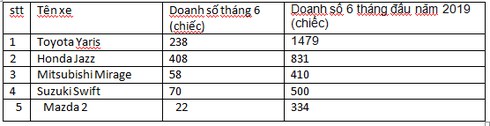 Doanh số xe hatchback hạng Btrong tháng 6 và 6 tháng đầu năm 2019. |