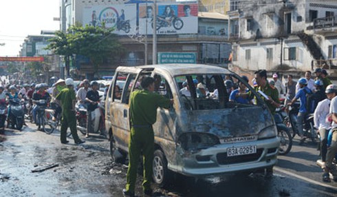 Vào khoảng 7 giờ 30 phút ngày 5-5, trên cầu Quay (phường 1, TP. Mỹ Tho, Tiền Giang), xe ô tô (7 chỗ ngồi) của Công ty Duy Quý BKS 63A - 029.51 đang chở khách đã bất ngờ bốc cháy dữ dội.