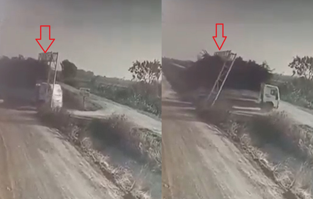 Xe tải chở quá khổ bứng luôn cổng chào tới vị trí không ai ngờ