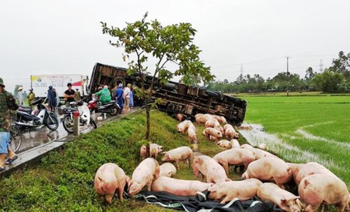 Cú va chạm rất mạnh khiến chiếc xe tải bị lật ngang xuống ruộng, tài xế bị thương nhẹ; hàng chục con lợn văng xuống ruộng, chạy tán loạn, một số con bị xe đè chết.