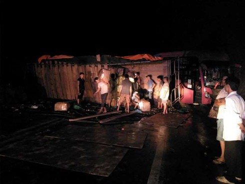 Ghi nhận của PV cho thấy, chiếc xe khách đâm vào vách núi khiến đầu xe biến dạng, toàn bộ phần cửa kính vỡ vụn, chiếc xe tải bị lật nằm vắt ngang đường hư hỏng nặng và 2 xe cẩu được điều tới để cầu 2 chiếc xe trong vụ tai nạn khỏi hiện trường. Hàng chục người trên chiếc xe khách đang ngồi bên đường chờ tiếp tục hành trình.