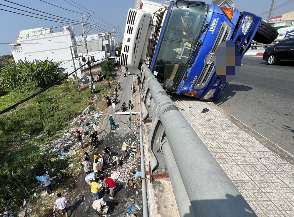 Lúc này, tài xế Út cố gắng tránh, chiếc xe tải bị chao đảo, va vào lan can rồi lật ngang. Tại hiện trường, thùng xe tải bị bung ra làm cá chim rơi xuống đường.