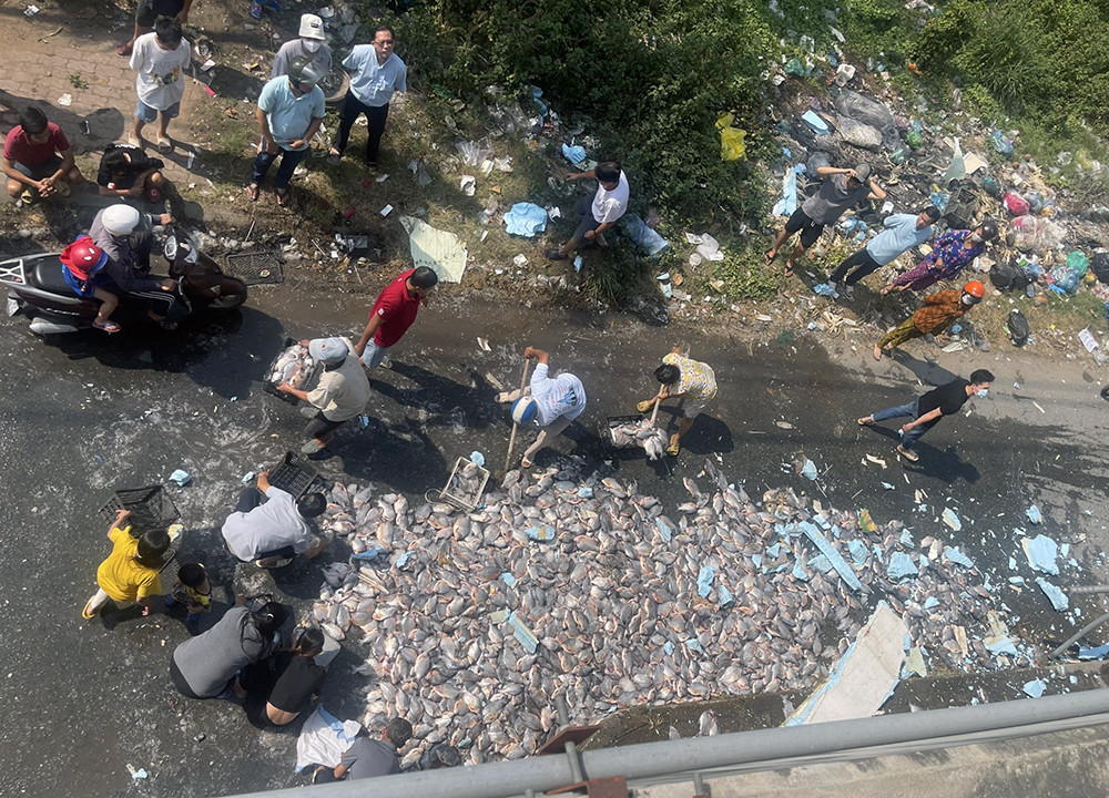 Xe tải lật trên cầu, người dân giúp tài xế gom hàng tấn cá