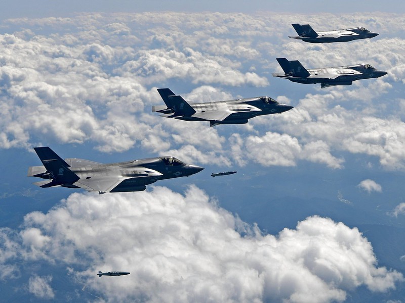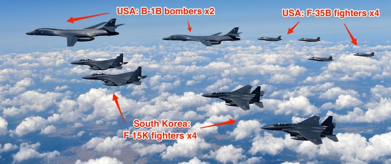 Hai máy bay ném bom B-1B bay từ căn cứ Không quân Andersen, đảo Guam. Bốn chiến đấu cơ F-35 bay từ trạm quân đoàn thủy quân lục chiến Iwakuni ở phía nam Nhật Bản. Trên ảnh là các chiến đấu cơ F-15K của Hàn Quốc đang thả bom MK-82 xuống cùng một khu vực như trên. |