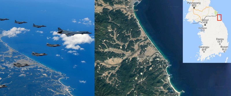 Máy bay Mỹ và Hàn Quốc bay gần đường ranh giới quân sự (MDL), chia cách hai miền Triều Tiên. Đường ranh giới quân sự, hay còn được gọi là vĩ tuyến 38, bao gồm khu vực phi quân sự ở sát cạnh. Các quan chức không cho biết địa điểm chính xác của cuộc tập trận nhưng những hình ảnh cho thấy phi đội này bay phía trên bờ biển phía đông của Hàn Quốc, cách biên giới khoảng 32 km. |