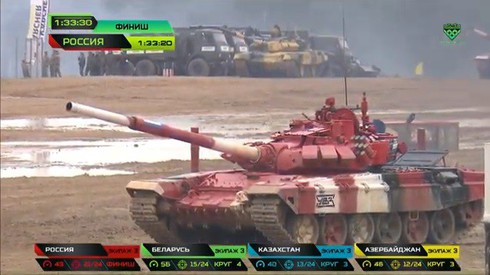 Tại trận chung kết Tank Biathlon Nhóm 1, Đội tuyển Nga sử dụng xe tăng màu đỏ. Nguồn TVzvezda |