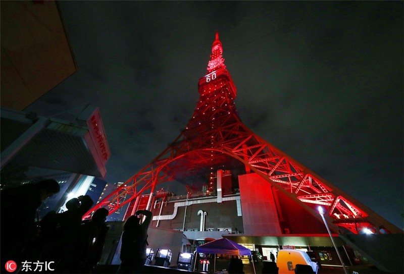 Lần đầu tiên, Tháp Tokyo được trang hoàng ánh đèn đỏ rực chào đón Năm mới 2019. |