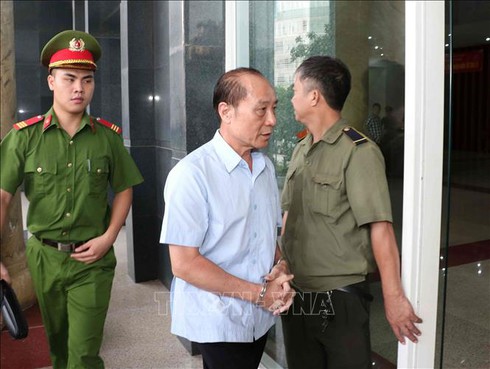 Cảnh sát dẫn giải bị cáo Phan Văn Anh Vũ (SN 2/11/1975, cựu Chủ tịch HĐQT Công ty Xây dựng Bắc Nam 79; cựu Chủ tịch HĐQT Công ty Nova Bắc Nam 79; cựu Thượng tá, Phó trưởng phòng Tổng cục V, Bộ Công an) đến tòa. (Ảnh: Văn Điệp/TTXVN) |