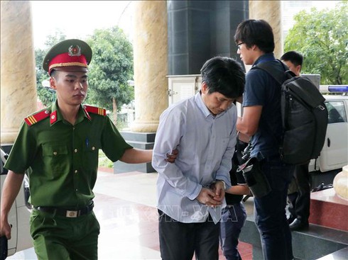 Cảnh sát dẫn giải bị cáo Phan Văn Anh Vũ vào khu vực xét xử. (Ảnh: Phạm Hải/Vietnamnet) |