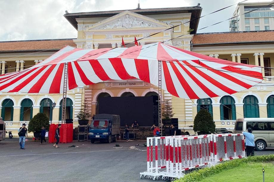Để phục vụ người dân theo dõi phiên xử vào sáng 25/11, Toà dựng rạp ngoài sân, chuẩn bị 200-300 ghế và gắn một màn hình lớn.
