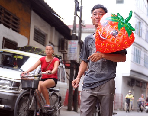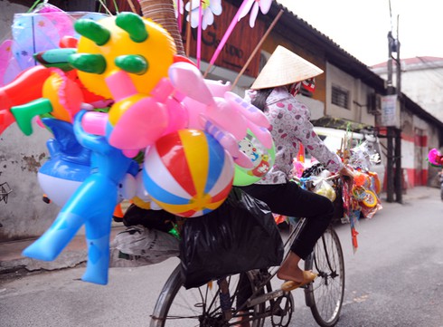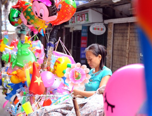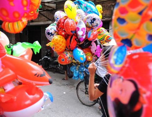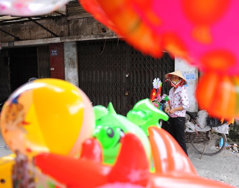 Góc ngõ nhỏ trong phố Trần Quý Cáp những ngày này trở nên nhộn nhịp hơn bởi những người bán bóng bay đang tranh thủ kiếm thêm thu nhập trong dịp Quốc khánh. |