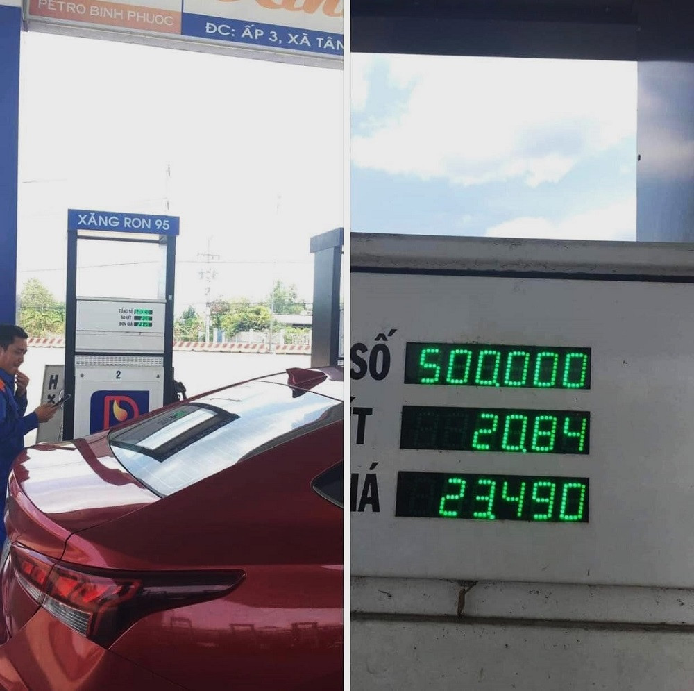 Theo đó, với đơn giá xăng RON 95-III tại tỉnh Bình Phước (vùng 2) có giá 23.490 đồng/lít, số lít xăng được người dân đổ là 20,84 lít; tổng thành tiền là 489.531,6 đồng. Tuy nhiên, bảng giá điện tử trên cây xăng nói trên lại tự động số tiền làm tròn là 500.000 đồng, chênh lệch hơn 10.000 đồng so với giá trị tiền thực đổ.