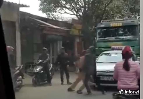 Một lúc sau lại tiếp tục xuất hiện một thanh niên mặc áo phông màu trắng xám ra co kéo. Khi bị 2 đối tượng xô đẩy, chiến sĩ cảnh sát đã bị rơi cả chiếc mũ đội trên đầu.