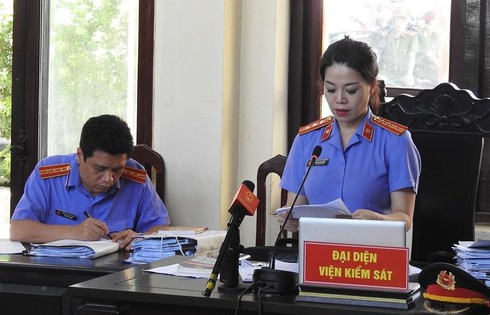 Kiểm sát viên Bùi Thị Thu Hằng tại phiên sơ thẩm lần 1, tháng 5/2018. |