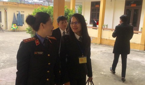 Kiểm sát viên Bùi Thị Thu Hằng (bên trái) và luật sư Trần Hồng Phúc (người bào chữa cho bị cáo Hoàng Công Lương) tại phiên tòa đang được TAND TP Hòa Bình xét xử công khai. |