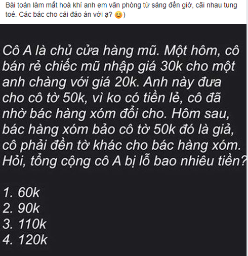 Bạn đọc Lê Mỹ cho rằng: "Cái mũ 30K bán 20K là lỗ 10K; Tiền 50K đổi bác hàng xóm là giả mất 50K. Nên cô này mất cái mũ 30K, mất không 30K tiền trả lại, mất tiếp 50k tiền giả, như vậy là 110k tất cả".