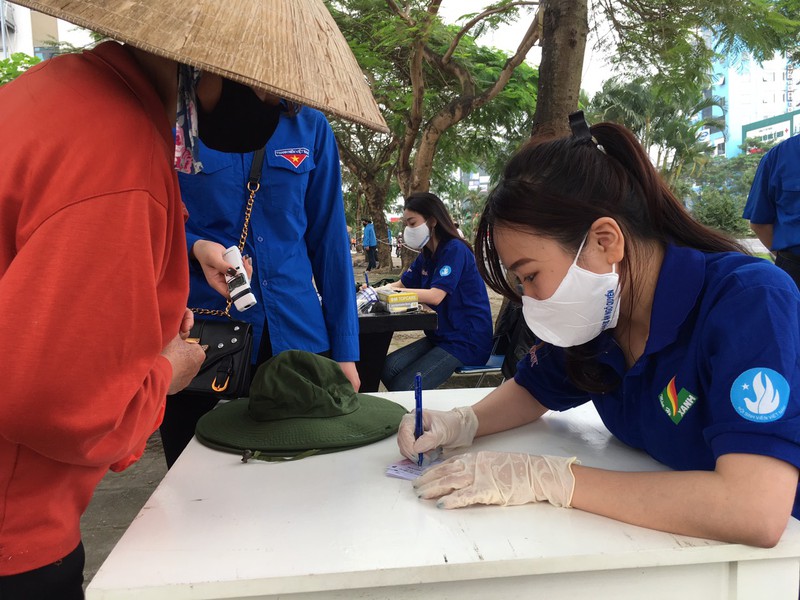 Đoàn viên quận Ngô Quyền viết phát phiếu gạo cho người dân. |