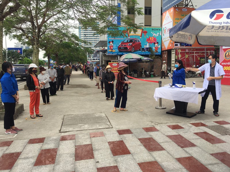 Người dân đứng xếp hàng ngay ngắn, giãn cách chờ nhận gạo. |