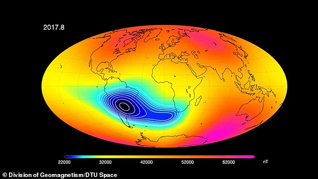 Một khu vực rộng lớn đang có hiện tượng suy giảm hoạt động từ trường. Các nhà khoa học chỉ ra khu vực này trải dài từ châu Phi đến Nam Phi, gọi là Vùng Dị thường Nam Đại Tây Dương.