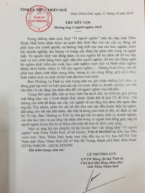 Trông bức thư kêu gọi, Bí thư Tỉnh ủy Thừa Thiên–Huế viết “Trong những năm qua, Quỹ “Vì người nghèo” trên địa bàn tỉnh Thừa Thiên - Huế luôn nhận được sự quan tâm lãnh đạo của các cấp ủy đảng, sự phối hợp của chính quyền, sự hưởng ứng tích cực của các ban, ngành, đoàn thể, doanh nghiệp, lực lượng vũ trang, các tầng lớp nhân dân trong và ngoài tỉnh.