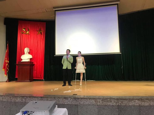 Hình ảnh của Băng tại buổi chia sẻ với bệnh nhân của Viện huyết học và truyền máu trung ương. |