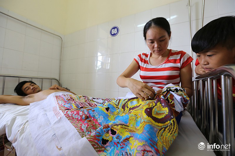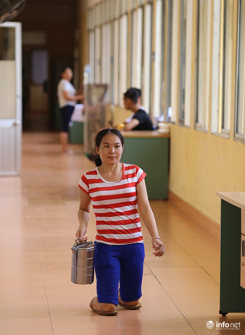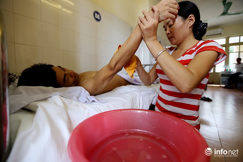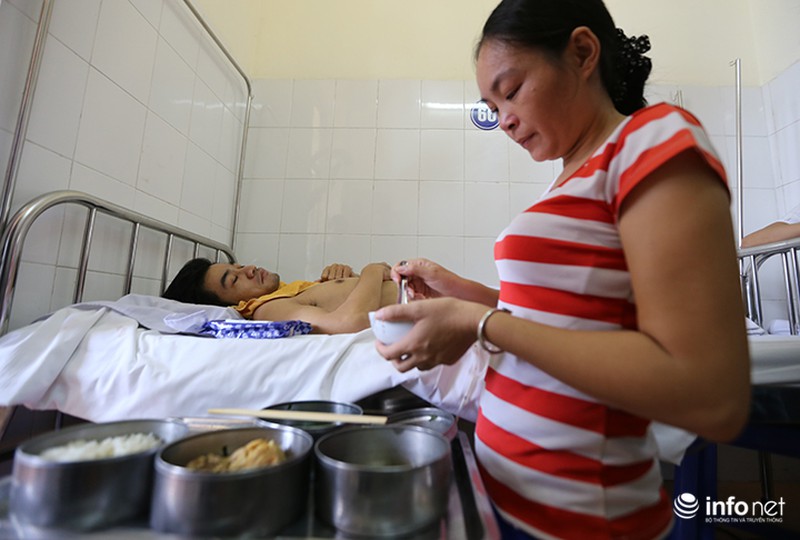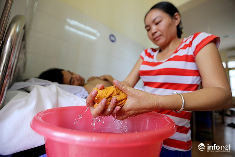 Hàng ngày, chị Đào vẫn chăm cho anh Cường từ bữa cơm đến việc tắm rửa. Thông cảm với hoàn cảnh của anh chị,những người cùng phòng bệnh và nhiều y bác sĩ ở đây mua cơm ngoài ăn còn nhường tiêu chuẩn của mình cho gia đình anh Cường. |