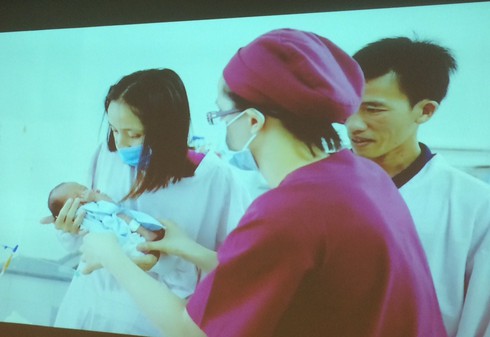 Vợ chồng chị D. lần đầu được gặp con sau ca đại phẫu. |