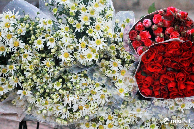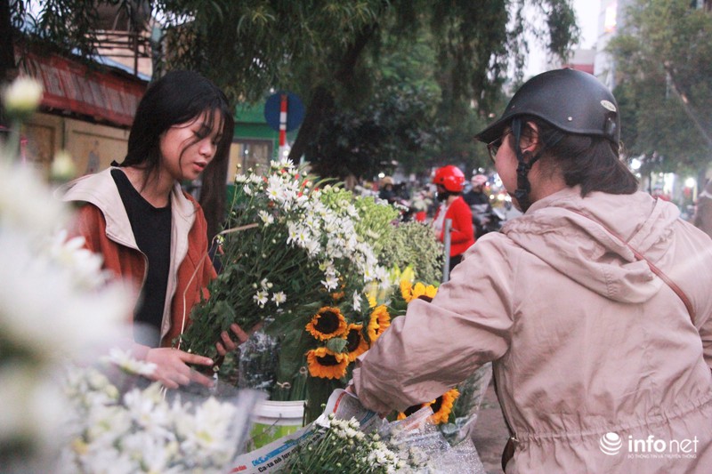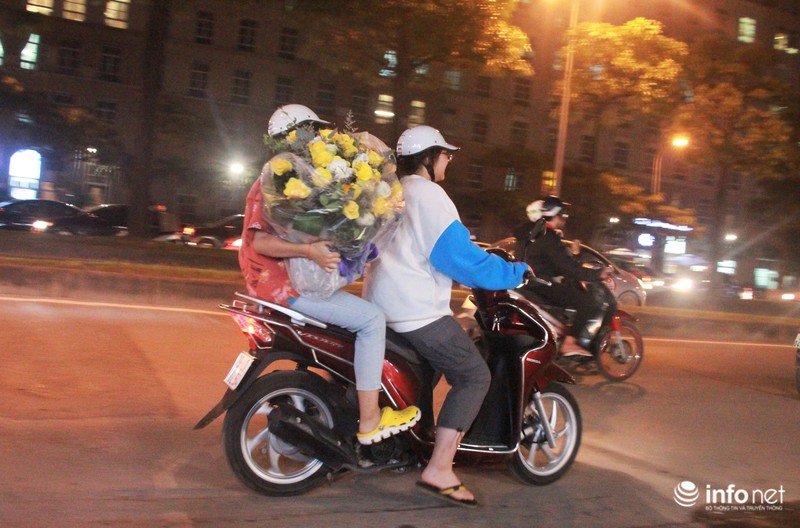 Đến tận tối muộn, nhưng các chợ hoa vẫn tấp nập. Đối với những người đã ra trường, tranh thủ thời gian đi làm về được nghỉ mua những bó hoatặng thầy cô trong ngày 20/11. |
