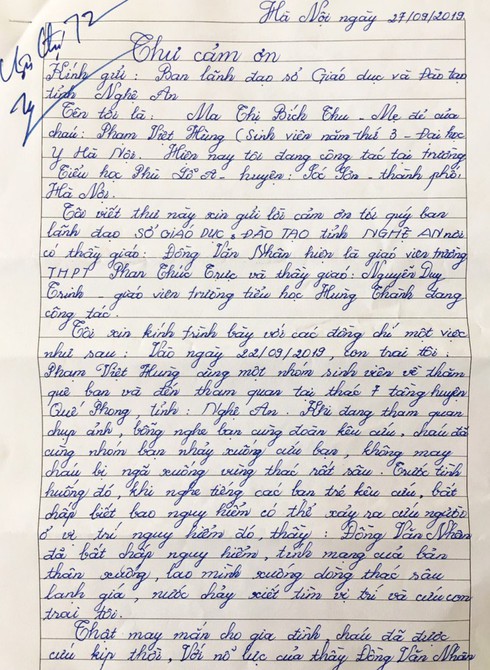 Bà Thu chia sẻ trong bức thư: “Thật may mắn cho gia đình, cháu đã được cứu kịp thời. Với nỗ lực của thầy Đồng Văn Nhân và Nguyễn Duy Trình có nghiệp vụ sơ cứu nạn nhân đuối nước đúng đắn, khoa học giúp cháu thoát khỏi lưỡi hái tử thần, thở được lại và chuyển lên xe cấp cứu đến bệnh viện”.