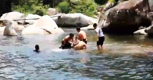 Các thầy giáo nỗ lực cứu vớt, đưa em Hùng dưới thác sâu lên bờ. |