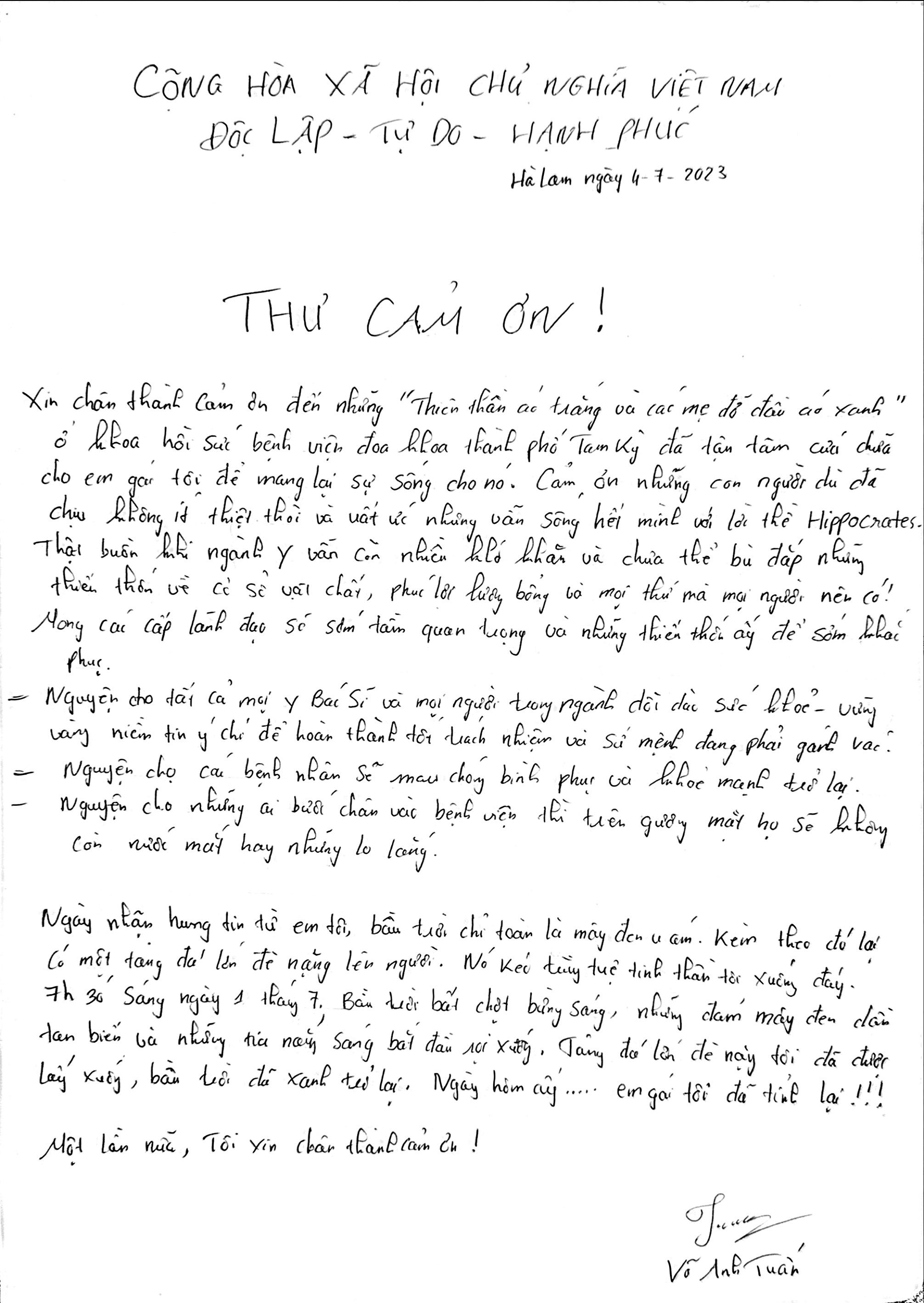 Gia đình bệnh nhân gửi thư cảm ơn đến Bệnh viện Đa khoa tỉnh Quảng Nam đã cứu chữa người thân.
