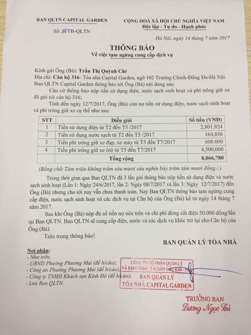 Ông Lương Ngọc Tú cũng cho biết, trước khi cắt điện, nước, Ban quản lý tòa nhà đã gửi thông báo lần 3 đến các căn hộ bị cắt điện, lần cuối cùng Ban đã gửi đến cả chính quyền, gồm UBND phường và công an phường Phương Mai.