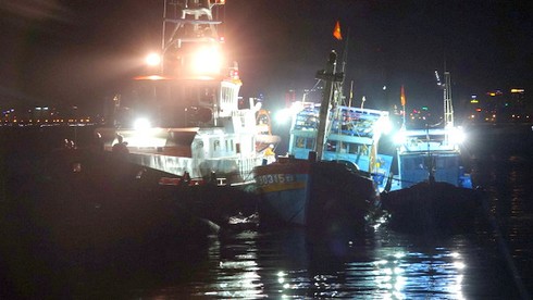 Tàu cứu hộ SAR 412 lai dắt 2 tàu cávà 16 thuyền viên gặp nạn về Đà Nẵng lúc 23 giờ 45 đêm 07/5. |
