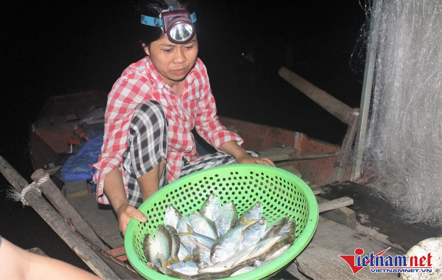 Đã 22h đêm, chị Nguyễn Thị Mai (SN 1987, trú xóm 1, xã Thanh Hà, huyện Thanh Chương, Nghệ An) vẫn đang cần mẫn gỡ những con cá mòi sau mẻ lưới. Cách đó không xa, anh Trần Văn Tài (SN 1983, chồng chị Mai) cũng đang buông lưới.