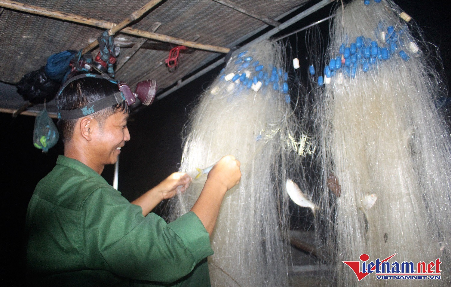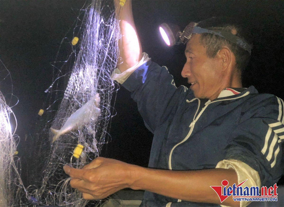 Cách thuyền chị Mai không xa, anh Trần Văn Nghiêm (SN 1988, trú xã Thanh Hà) cũng đang say sưa gỡ cá mẻ lưới đầu tiên trong đêm nay. Bố mất sớm từ khi đang học lớp 3, anh Nghiêm gắn bó với nghề chài lưới để mưu sinh từ nhỏ. Mẻ lưới đầu tiên, anh thu về được 2 - 3 kg cá tươi roi rói.