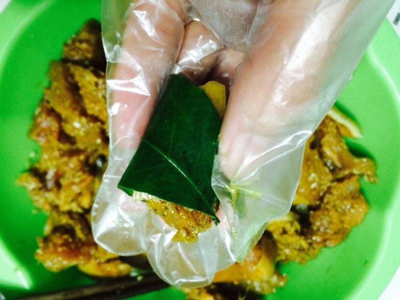 Dùng 1 lá mắc mật trải rộng ra, cho 1 miếng thịt lợn đã ướp gia vị vào cuộn đều, dùng tăm nhọn ghim chặt để lá mắc mật cuốn chặt vào thịt.