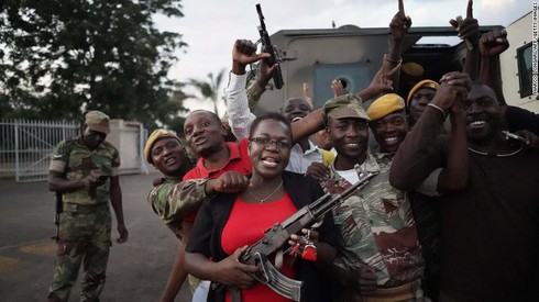 Người dân Zimbabwe ăn mừng cùng các binh sĩ trên đường phố. |